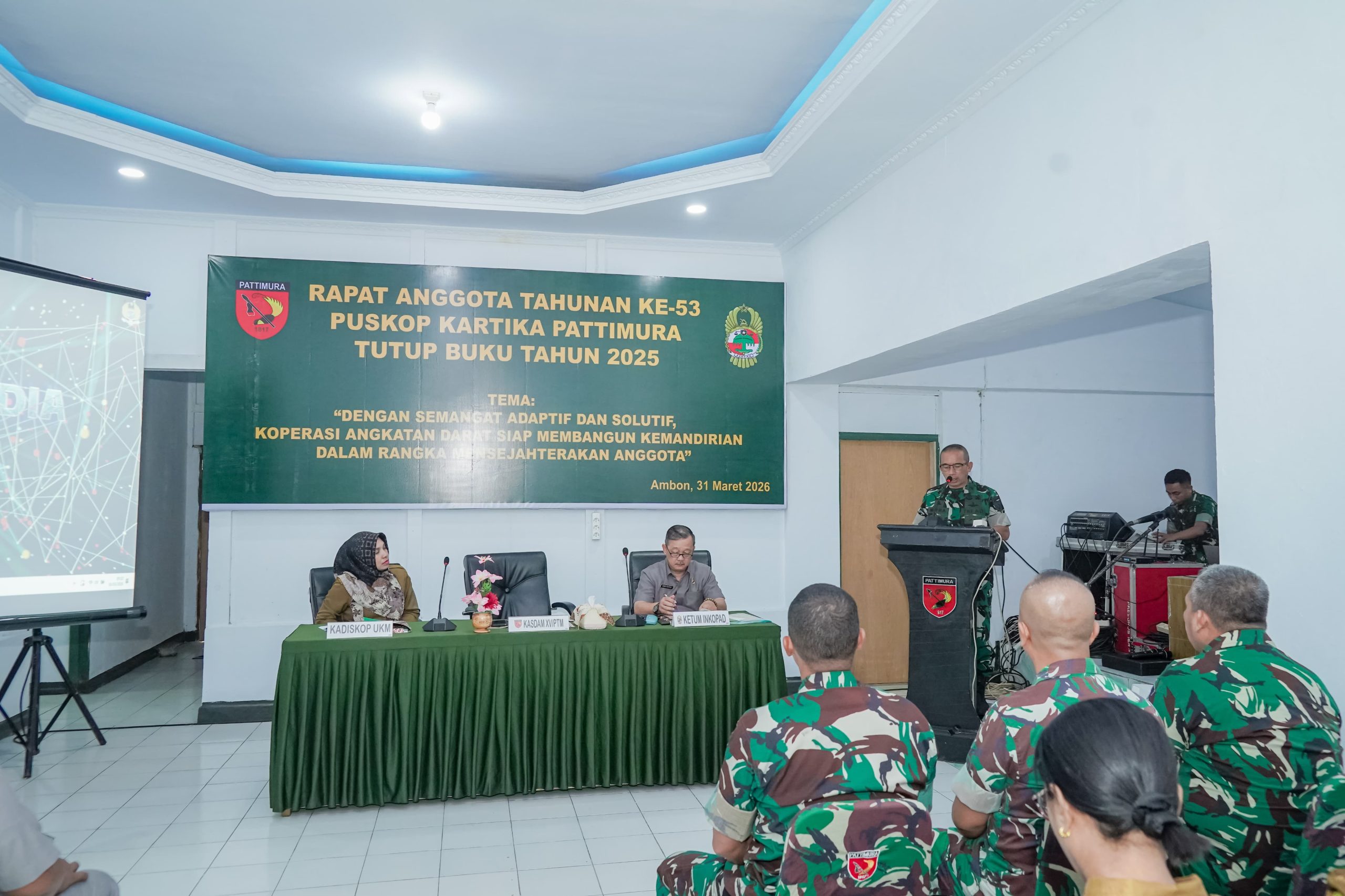 arumbae.com Ambon – Kasdam XV/Pattimura, Brigjen TNI Dr. Nefra Firdaus, S.E., M.M., secara resmi membuka Rapat Anggota Tahunan (RAT) Ke-53 Pusat Koperasi (Puskop) Kartika Pattimura Tutup Buku Tahun 2025. Kegiatan yang mengusung tema : “Dengan Semangat Adaptif Dan Solutif, Koperasi Angkatan Darat Siap Membangun Kemandirian Dalam Rangka Mensejahterakan Anggota” ini diselenggarakan di Kantor Puskop Kartika Pattimura, Ambon, Selasa (31/03/2026).