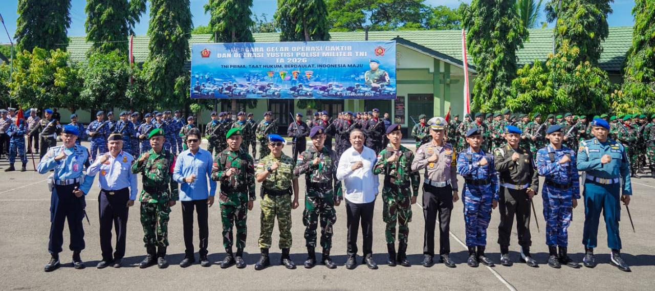 Arumbae.Com Ambon– Kasdam XV/Pattimura Brigjen TNI Dr. H. Nefra Firdaus Lubis, S.E., M.M. mewakili Pangdam XV/Pattimura Mayjen TNI Putranto Gatot Sri Handoyo, S.Sos., M.M., memimpin Upacara Gelar Operasi Penegakan Ketertiban (Gaktib) dan Operasi Yustisi Tahun Anggaran 2026, di Lapangan Makodam XV/Pattimura, Ambon, pada Jumat (13/2/2026). Kasdam selalu Insperktur Upacara mengecek pasukan yang terlibat dalam upacara dengan mengenakan seragam green sage lengkap dengan baret berwarna biru Polisi Militer (PM).