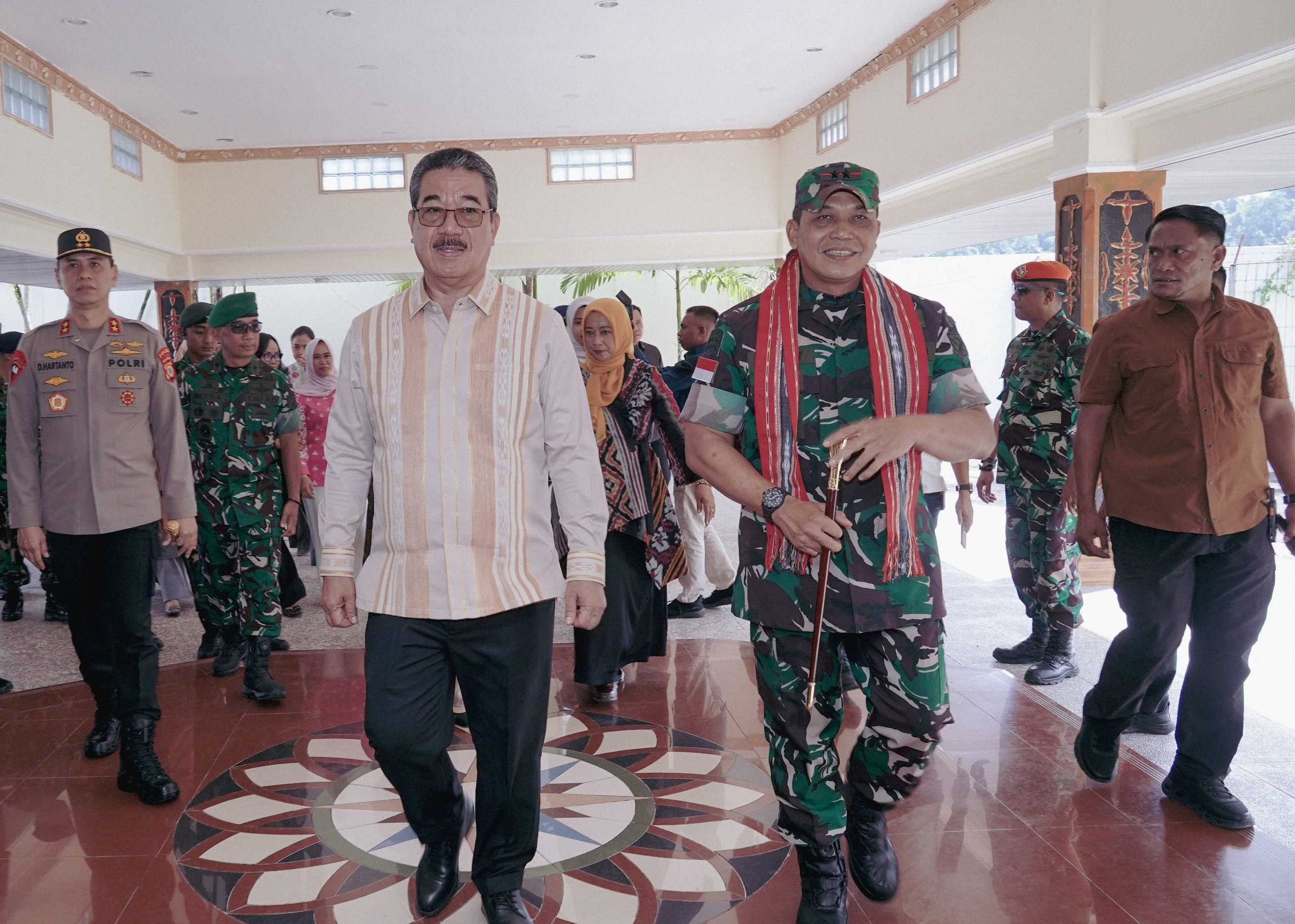 ​Setibanya di VIP Room Bandara Pattimura, suasana seketika berubah meriah sekaligus sakral. Gubernur Maluku, Hendrik Lewerissa, menyambut langsung Sang Jenderal Petarung dengan prosesi pengalungan kain tenun khas Maluku sebagai simbol penghormatan tertinggi dan ikatan persaudaraan yang abadi. Kemeriahan semakin memuncak saat tarian Lenso dari anggota Persit Yonif 733 dan dentuman musik Totobuang dari Sanggar Wairanang Negeri Soya mengiringi langkah Sang Panglima baru.