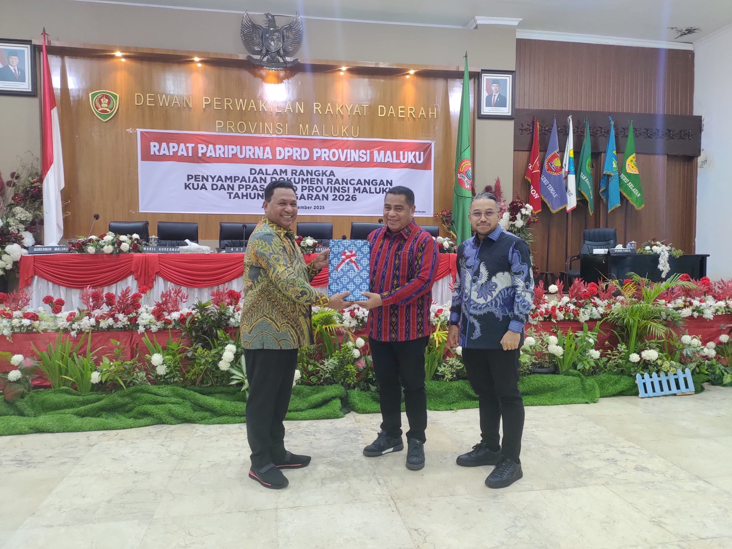 Rapat Paripurna DPRD Provinsi Maluku dalam rangka penyampaian Rancangan Kebijakan Umum Anggaran serta Prioritas dan Plafon Anggaran Sementara (KUA-PPAS) Tahun Anggaran 2026 dihadiri oleh Ketua, Wakil Ketua, dan seluruh Anggota DPRD Provinsi Maluku, Forum Koordinasi Pimpinan Daerah (Forkopimda) Provinsi Maluku atau yang mewakili, para Staf Ahli dan Asisten Sekretaris Daerah (Sekda) beserta pimpinan Organisasi Perangkat Daerah (OPD) di lingkungan Pemerintah Provinsi Maluku, serta rekan-rekan media cetak dan elektronik. (*)